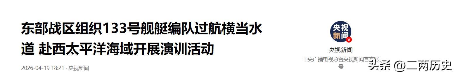 2、《东部战区组织133号舰艇编队过航横当水道 赴西太平洋海域开展演训活动》2026-04-19 18:21·央视新闻。